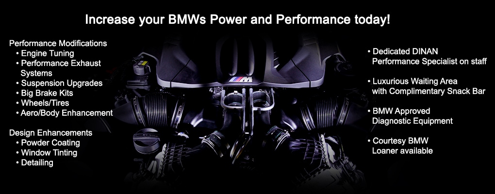 The Performance Center offers the full range of Dinan performance modifications, including engine tuning, performance exhaust systems, upgraded suspensions, brake kits, new wheels and tires, and aerodynamic and body enhancements. We also provide design enhancements such as window tinting, powder coating and detailing. You can conveniently browse our Online Dinan Parts Catalog to locate the exact product you seek. Furthermore, our specialists may be able to locate Dinan products that are no longer available in the catalog.